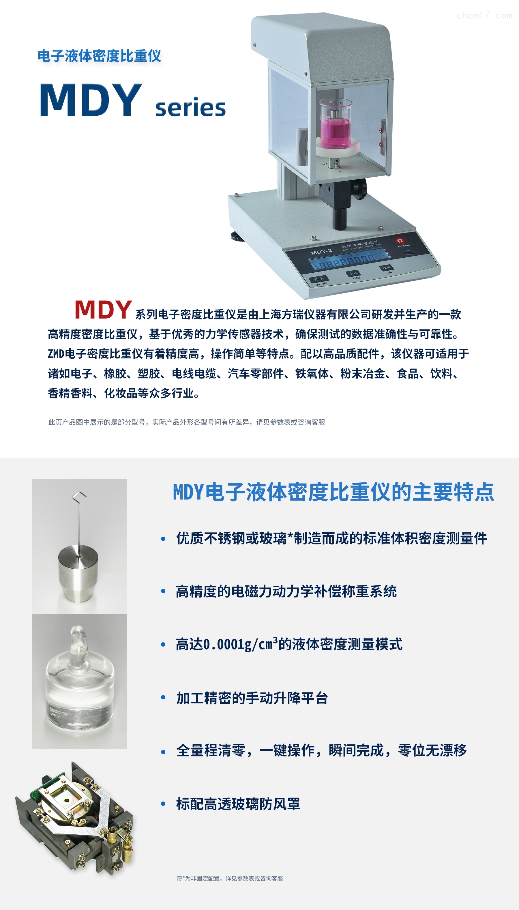 MDY-2 液体比重仪转为测量液体密度设计,有升降平台,可选恒温杯,操作非常方便。标配的是5立方厘米的不锈钢标准件,也可选配耐酸碱的铂金丝+玻璃体的标准体积件。
